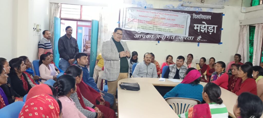 पंतनगर। भारतीय कृषि अनुसंधान परिषद-भारतीय गेहूं एवं जौ अनुसंधान संस्थान, करनाल हरियाणा के सौजन्य से पंतनगर विश्वविद्यालय में संचालित अखिल भारतीय समन्वित गेहूँ एवं जौ अनुसंधान परियोजना के अंतर्गत अनुसूचित जाति उप योजना (एस.सी.एस.पी.) के किसानों को कृषि के क्षेत्र में सशक्त एवं आत्मनिर्भर बनाने के उद्देश्य से निःशुल्क कृषि सामग्री वितरण कार्यक्रम का सफल आयोजन किया गया। यह कार्यक्रम दिनांक 20-28 फरवरी, 2026 को जनपद नैनीताल के सूरिया ग्राम, मझेड़ा एवं जनपद उधमसिंह नगर के ढकिया कलां ग्राम, काशीपुर, जसपुर एवं कोटाबाग के कृषि ग्रामीणों के लिए आयोजित किया गया। कार्यक्रम में लगभग 300 से ज्यादा लाभार्थी किसान उपस्थित रहे।