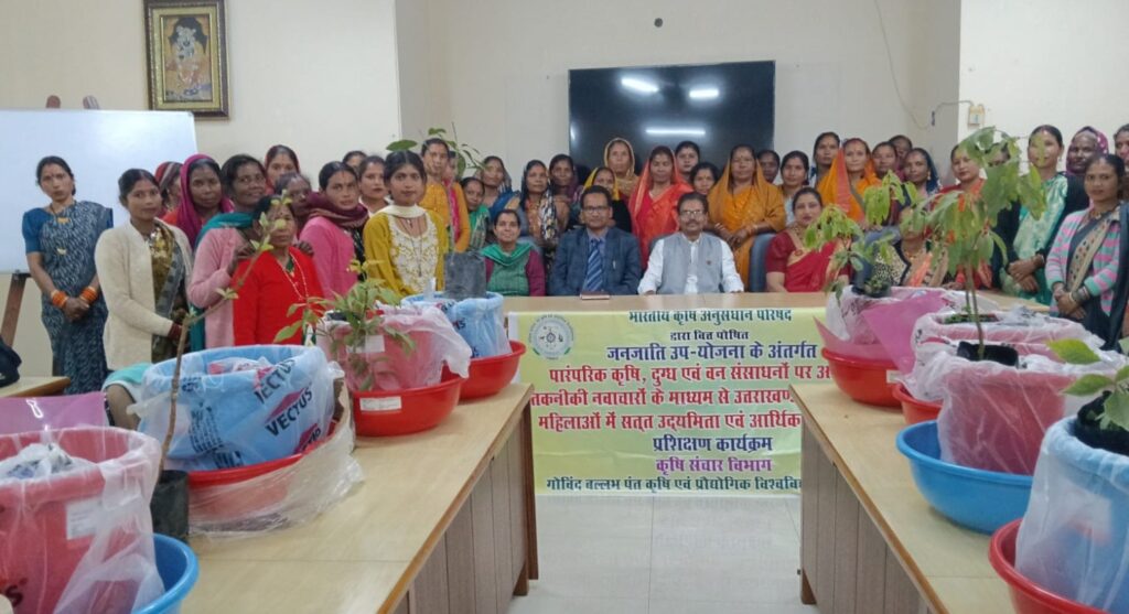 पंतनगर कृषि विश्वविद्यालय में कृषि महाविद्यालय के कृषि संचार विभाग द्वारा भारतीय कृषि अनुसंधान परिषद से वित्तपोषित जनजातीय उप योजना के अंतर्गत ‘औद्यानिकी एवं औषधीय पौधों की खेती को आजीविका संवर्धन हेतु प्रोत्साहन’ विषय पर दो-दिवसीय प्रशिक्षण कार्यक्रम का आयोजन किया गया। इस प्रशिक्षण में विकासखंड गदरपुर के ग्राम कुल्हा की अनुसूचित जनजाति की महिलाओं ने उत्साहपूर्वक सहभागिता की।